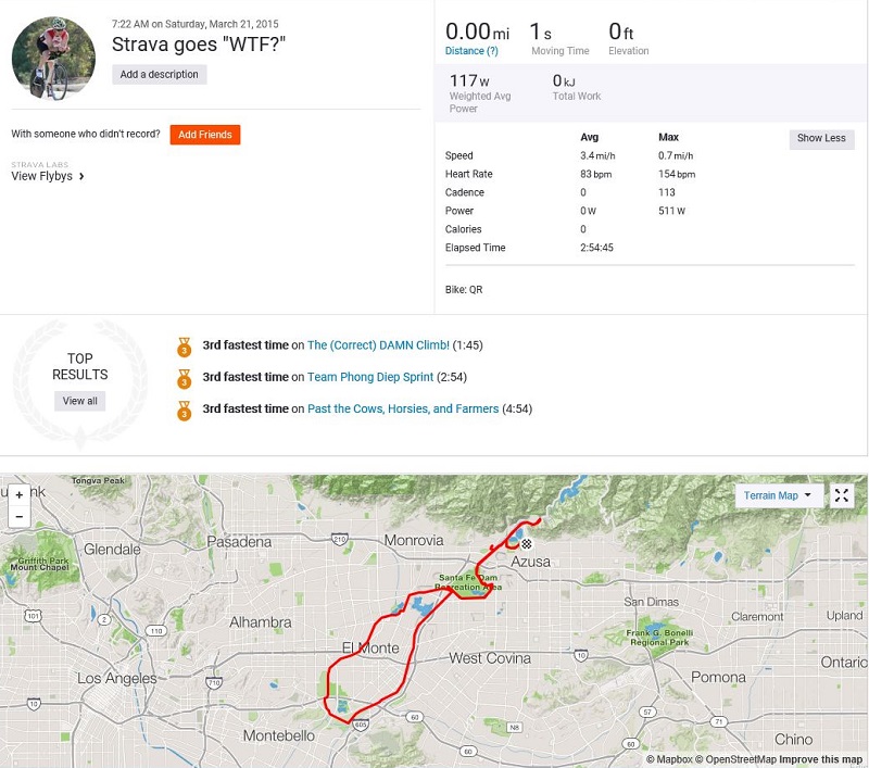Here’s Tuesday’s Time Travel Ride. There’s a glitch in the GPS at mile 25. No unlikely top speeds. Unfortunately, I was going for a Strava PR right after that glitch (the southernmost point in the ride), and I can’t see it.