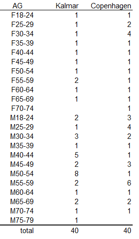 Assuming all age groups winners take their slots and no roll-down I come to this overview. 22 Different age groups are present at both races, so 22 of the 40 slots are already taken. This means 18 slots remain for the general population so you simply go down the list, excluding the age group winners, until you reach 18. Interesting to see that there are some very fast M50-54 triathletes in Kalmar while in Copenhagen only the winner directly qualifies in this AG.